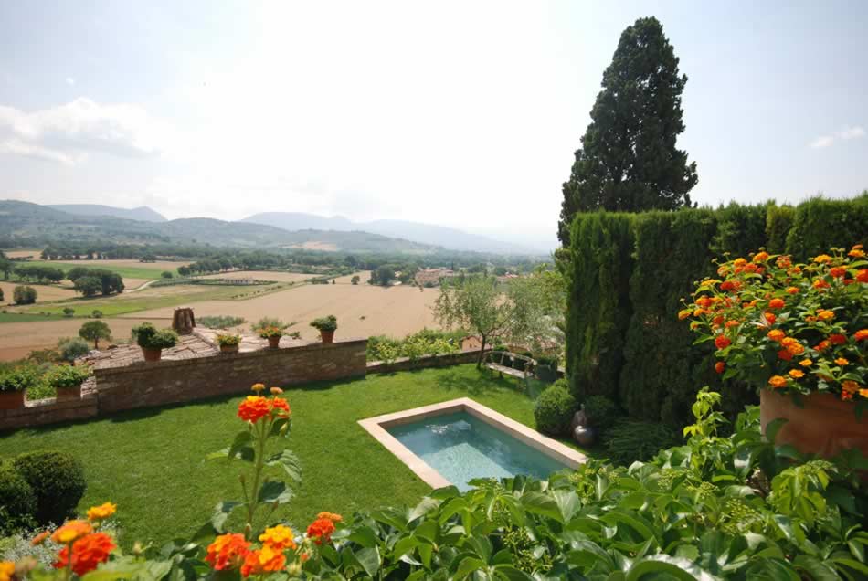 The outdoor seating and dining area, its large table and comfortable chairs, are set under ancient vaulted arches. A low retaining wall provides unobstructed views of the countryside beyond, stunning at sunset. The pool is set back and to the side of the villa, where lush green lawns, cool underfoot, provide plenty of room for sunbathing or entertaining. Roses, olive trees and cypress trees make the garden a quiet contemplative oasis.
